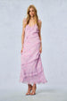 Our best-selling Radiance Dress returns as part of our Fragrance Capsule Collection, this time arriving in our beloved perfume prints. This dreamy maxi is designed with a printed chiffon fabric for the warm weather season. With an airy and breezy silhouette, the dress is stripped with delicate laces all over sourced from vintage textiles. The pieces begin with lace straps that fall to tiny flutter sleeves that fall to an easy skirt with tiny ruffle details all over.